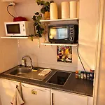 Eine Küche mit einem Kühlschrank und Küchenutensilien gehört zur Ausstattung der Unterkunft für Selbstversorger. Die Bushaltestelle Rapp befindet sich ein paar Schritte entfernt von der Ferienwohnung Le Cocon Du Vieux Colmar entfernt.